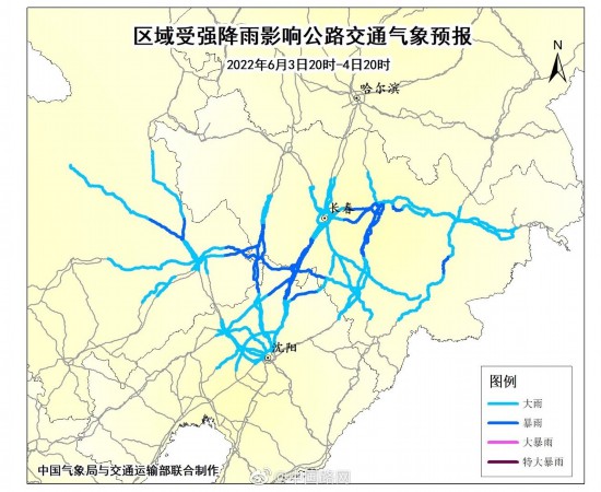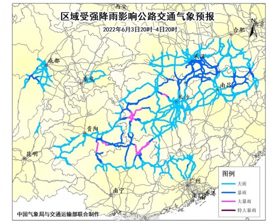 中央气象台6月3日18时发布暴雨黄色预警:预计,6月3日20时至4日20时,贵州东部和南部、湖南西部和北部、湖北中东部、安徽西南部、江西北部、广西北部、广东北部以及内蒙古东南部、吉林大部、辽宁北部等地的部分地区有大到暴雨,其中,贵州东南部、湖南西部和东北部、广西东北部等局地有大暴雨。上述部分地区伴有短时强降水,局地有雷暴大风等强对流天气。G5513长张高速、G60沪昆高速、G72泉南高速、G209、G320等部分路段通行可能受到影响。提示司机朋友注意关注路况信息,注意行车安全!