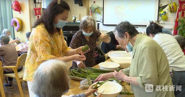 为了让老年人们能够感受到端午节日的仪式感,工作人员还陪着老人们一起缝香包、包粽子。