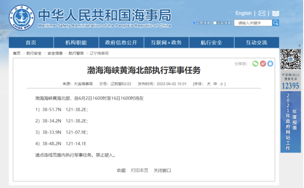 据中国海事局网站消息,大连海事局发布航行警告,6月2日16时至16日16时,渤海海峡黄海北部执行军事任务,禁止驶入。详情>>