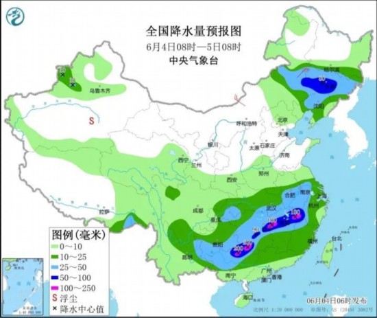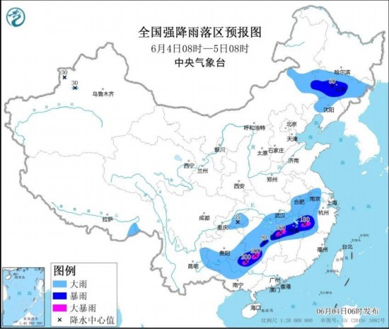 预计,4日08时至5日08时,贵州东部和南部、湖南西部和北部、湖北东部、安徽南部、江西北部、广西北部以及内蒙古东部、吉林大部、辽宁中北部等地的部分地区有大到暴雨,其中,广西东北部、湖南东北部、江西西北部和东北部等局地有大暴雨(100~200毫米)。