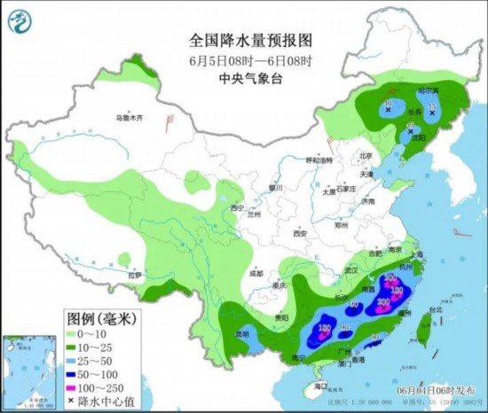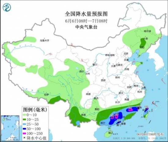 6月6日,降雨带将移至江南南部到华南一带,江西南部、福建中南部、广西东部和南部、广东西部和南部沿海、台湾岛北部等地的部分地区有暴雨,局地大暴雨。