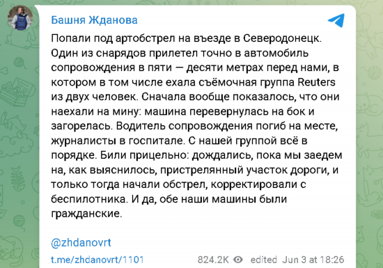 Igor Zhdanov表示,虽然他乘坐的车辆避开了炮弹,但附近两名路透社记者乘坐的车辆却未能幸免,被击中后翻了车,司机当成死亡,两名记者也受了伤,目前已经被送医。