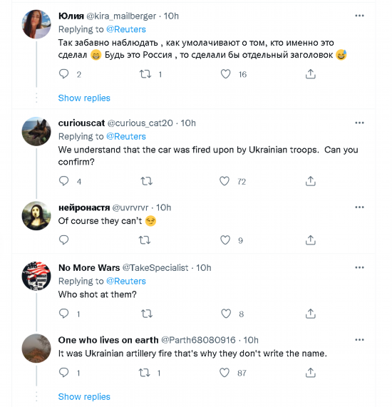 路透社的这一怪异的报道口吻很快引起了一些支持俄罗斯的外国网民的不满,认为这家英国媒体在刻意回避或隐瞒乌军炸伤两名记者的情况。有网民还表示如果是俄军炸的,路透社早就在大标题里把俄罗斯写出来了。