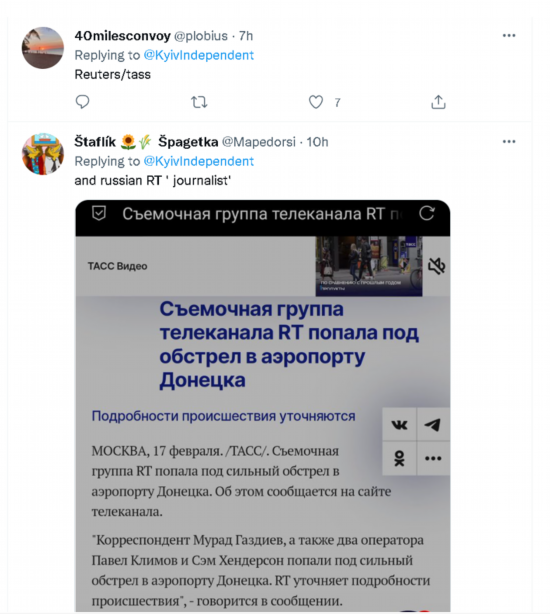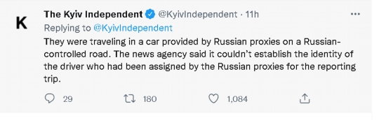 如下图所示,乌克兰的《基辅独立报》就在报道此事的帖文中进一步特别强调说,两名记者乘坐的是亲俄武装提供的车辆,行驶在俄方控制的道路上。