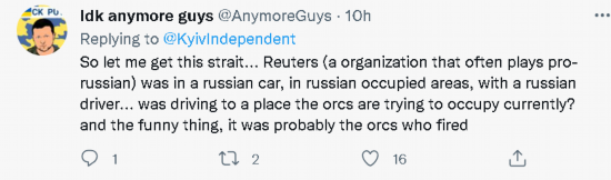 这一消息也令境外社交网络上支持俄罗斯的账号认定炸伤两名路透社记者的是乌克兰军方。