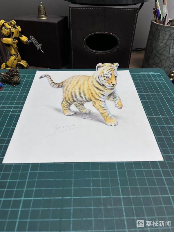 2018年7月开始,他陆续在短视频平台上发布作品。“像这张《鸽子》也是最近画的,在一张纸上它是平面的,画完以后,我们最终其实要斜着看它就有一个透视的这种感觉。今年不是虎年嘛,我们创造了一个《小老虎》非常可爱的,3D画欣赏的时候,它是这样一个角度,你看它就慢慢还原到,一个正常的小老虎的形状。”