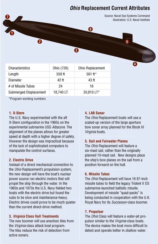 据介绍,“哥伦比亚”级虽然号称是“美国有史以来最先进的战略核潜艇”,但其实大量采用了成熟技术,以尽快替代日益老化的现役“俄亥俄”级战略核潜艇。根据美国海军此前公布的数据,“哥伦比亚”级携带的“三叉戟II” D5潜射洲际导弹与“俄亥俄”级相同,但数量只有16枚,少于“俄亥俄”级的24枚。美国海军最青睐它的优势是使用了新一代核反应堆,“可以一直使用到本世纪80 年代”,而不必返回造船厂更新更换核燃料。同时,该艇还大量采用了“弗吉尼亚”级攻击核潜艇的成熟技术,包括综合电力推进系统,尽量减少噪音以提升生存能力。