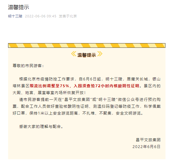 荔枝新闻讯 6月6日,昌平文旅集团发布温馨提示:根据北京市疫情防控工作要求,自6月6日起,明十三陵,居庸关长城,银山塔林景区限流比例调整至75%,入园须查验72小时内核酸阴性证明。景区内的大殿、地宫、展室等室内场所恢复开放!