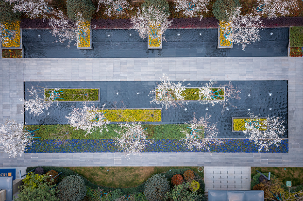 项目顺应地形,充分让渡自然。首先,以国际造园手法为主,打造十字轴线型大尺度景观面,放大视觉、听觉双重感官体验。