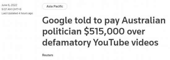 英媒:谷歌因YouTube诽谤视频被判定向澳政客支付51.5万美元