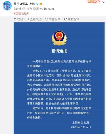 荔枝新闻讯 上海市公安局官方微博今日(6月6日)发布一则警情通报称:一男子因酒后扰乱核酸检测点正常秩序被警方依法刑事拘留。