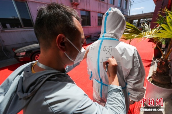 6月5日,工作人员配送前在防护服上写上名字。当日是端午假期第三天,北京市天坛街道和精忠社区的工作人员为西草市东街等封管控区居民配送生活物资。自5月26日西草市东街多个院落被划为封控管控区后,街道和社区工作人员24小时在一线值守,确保居民生活物资供应和就医买药等需求。 中新社记者 贾天勇 摄