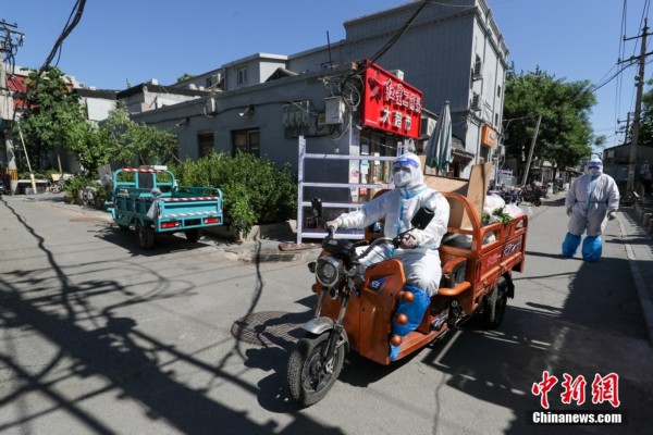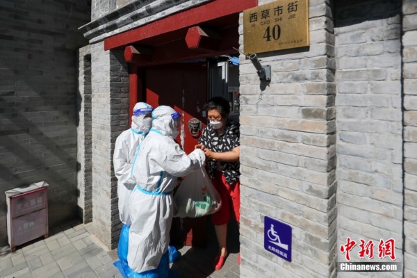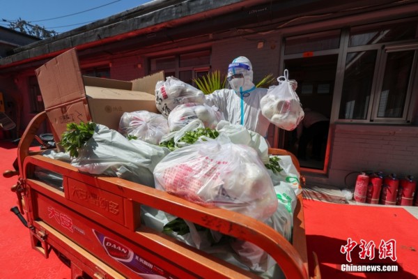 6月5日,端午假期第三天,北京市天坛街道和精忠社区的工作人员为西草市东街等封管控区居民配送生活物资。自5月26日西草市东街多个院落被划为封控管控区后,街道和社区工作人员24小时在一线值守,确保居民生活物资供应和就医买药等需求。 中新社记者 贾天勇 摄