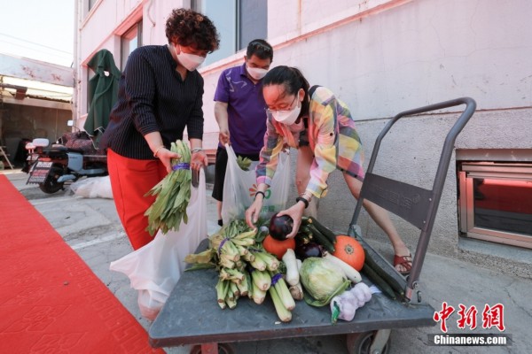 6月5日,工作人员为居民送去蔬菜。当日是端午假期第三天,北京市天坛街道和精忠社区的工作人员为西草市东街等封管控区居民配送生活物资。自5月26日西草市东街多个院落被划为封控管控区后,街道和社区工作人员24小时在一线值守,确保居民生活物资供应和就医买药等需求。 中新社记者 贾天勇 摄