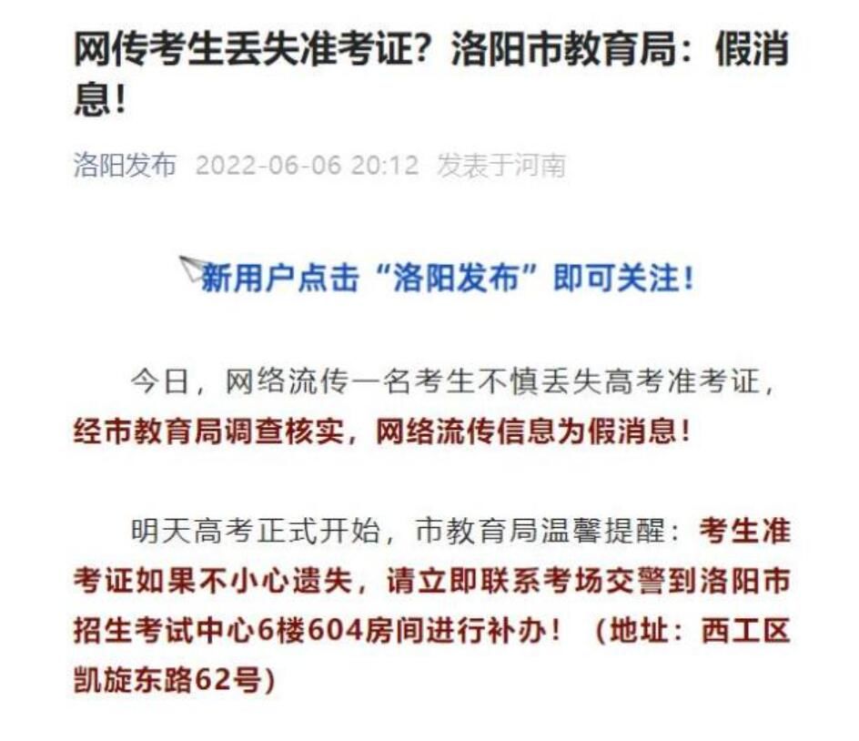 荔枝新闻讯 据洛阳发布微信公众号消息,今日,网络流传一名考生不慎丢失高考准考证,经洛阳市教育局调查核实,网络流传信息为假消息!