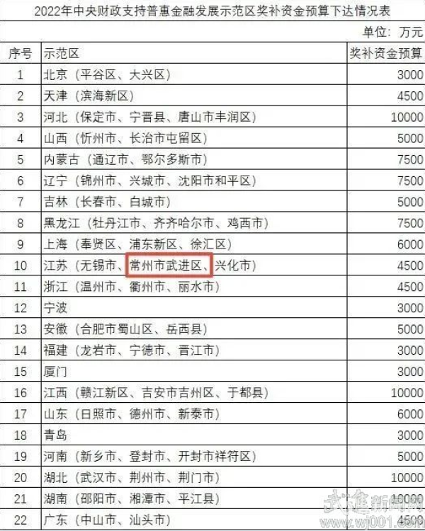 日前,财政部公布2022年中央财政支持普惠金融发展示范区名单,常州市武进区榜上有名,成为全省首批入选的三个地区之一。