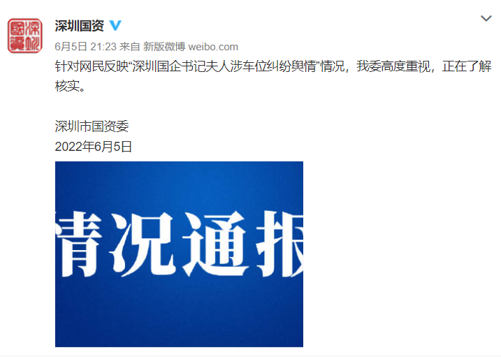 针对网民反映“深圳国企书记夫人涉车位纠纷舆情”情况,我委高度重视,正在了解核实。