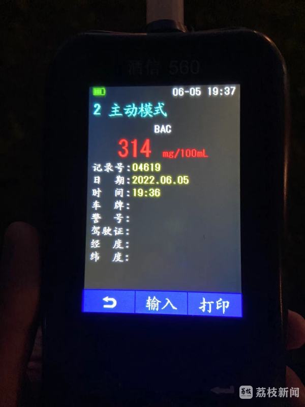 6月5日晚,扬州市公安局交警支队七大队在辖区杭集镇迎宾大道设点,开展酒驾、醉驾集中整治行动。约19时36分左右,朱某某因驾驶二轮摩托车未佩戴安全头盔被被执勤交警查获。现场,民警认为朱某某有酒驾嫌疑,遂当场对其进行呼气酒精含量检测。这一查可给民警吓坏了,朱某某的检测结果竟然达到了314mg/100ml。民警随即将其带到医院提取血样,做进一步检测。