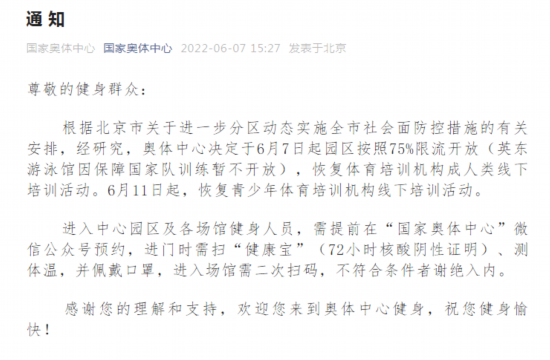 荔枝新闻讯 据国家奥体中心微信公众号消息,根据北京市关于进一步分区动态实施全市社会面防控措施的有关安排,经研究,奥体中心决定于6月7日起园区按照75%限流开放(英东游泳馆因保障国家队训练暂不开放),恢复体育培训机构成人类线下培训活动。6月11日起,恢复青少年体育培训机构线下培训活动。