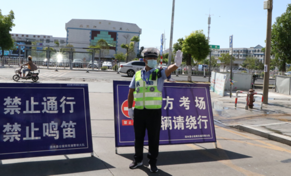 考试前,提前到岗到位,设置交通管制点,摆放警示、指路标志标牌,引导送考车辆有序停放。