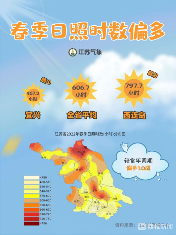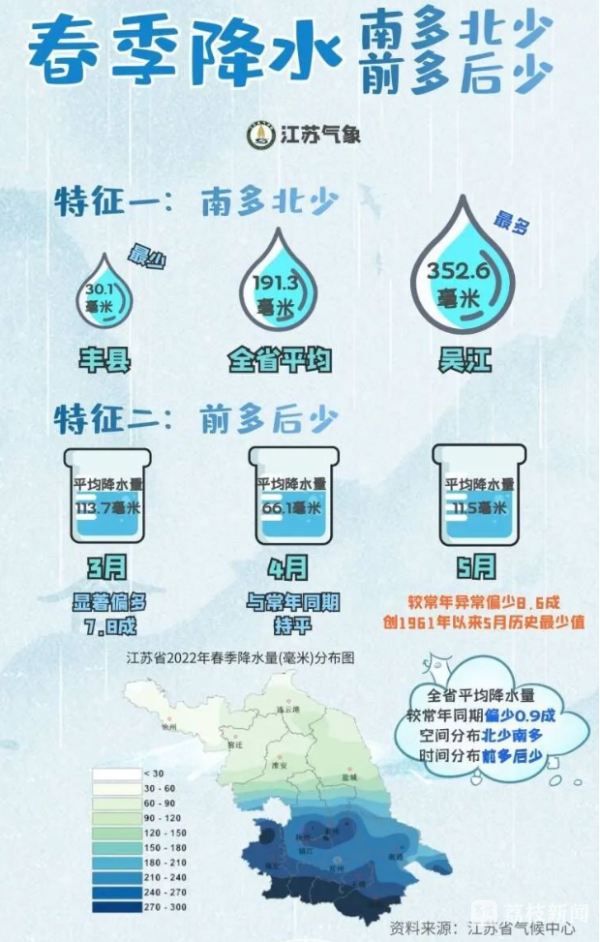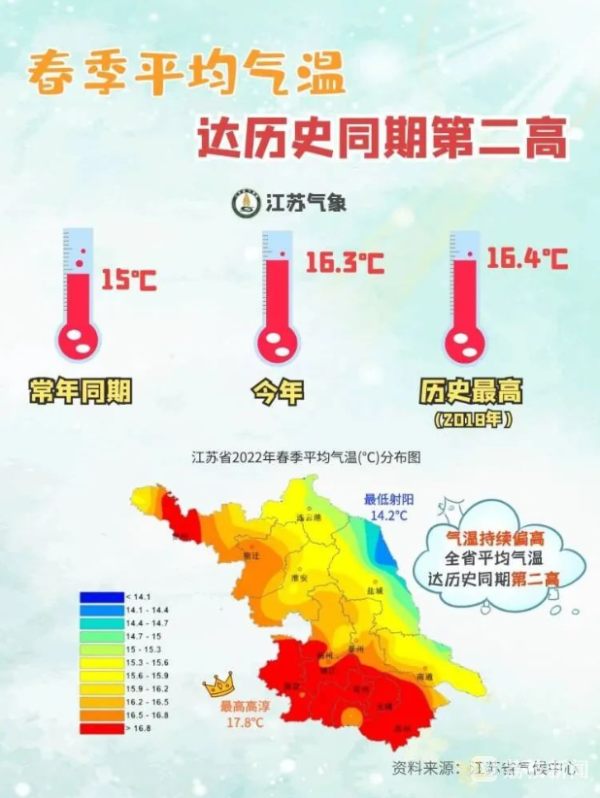 据江苏省气象台今天发布的“江苏省2022年春季气候影响评价”,今年春季全省气候特征表现为“温高雨少”,全省平均气温较常年明显偏高,降水总体偏少,春季全省日照时数较常年偏多。