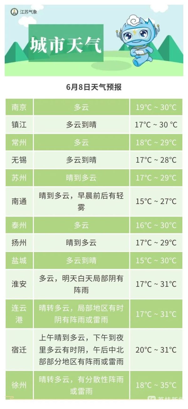 据江苏省气象台发布的消息:接下来的明后两天,全省仍以晴好天气为主,其中淮北部分地区有雷阵雨,局部可能伴有雷雨大风等对流性天气。气温变化不大,早晚凉爽。考生们可以静心答题,笑书人生、勇战夺魁。