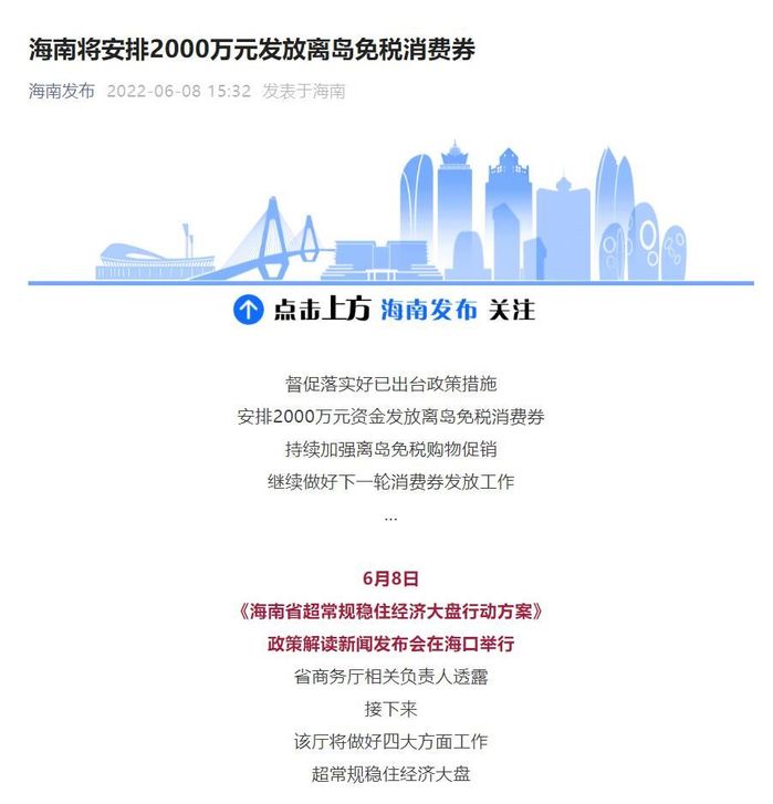 荔枝新闻讯 据“海南发布”微信号消息,海南将安排2000万元资金发放离岛免税消费券,持续加强离岛免税购物促销,对完成离岛免税销售年度目标任务的经营主体给予一定的销售奖励。