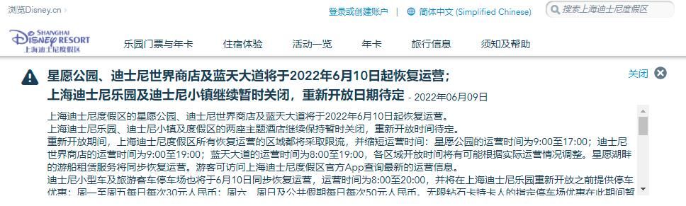 荔枝新闻讯 今天,上海迪士尼度假区宣布星愿公园、迪士尼世界商店及蓝天大道将于2022年6月10日起恢复运营。迪士尼乐园、迪士尼小镇及度假区的两座主题酒店继续保持暂时关闭,重新开放时间待定。
