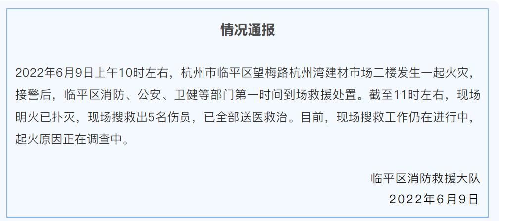 荔枝新闻讯 据“天天看临平”微信公众号消息,2022年6月9日上午10时左右,杭州市临平区望梅路杭州湾建材市场二楼发生一起火灾,接警后,临平区消防、公安、卫健等部门第一时间到场救援处置。截至11时左右,现场明火已扑灭,现场搜救出5名伤员,已全部送医救治。目前,现场搜救工作仍在进行中,起火原因正在调查中。