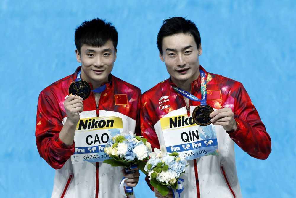 2015年7月28日,在俄罗斯喀山进行的第16届游泳世锦赛男子双人三米板决赛中,中国选手秦凯/曹缘以471.45分的总成绩夺得冠军。图为秦凯/曹缘在颁奖仪式上。