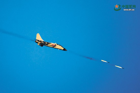 北部战区海军航空兵某旅组织战术射击训练,检验飞行员低空机动突防能力。图为战机俯冲向目标发射火箭弹。张 越摄