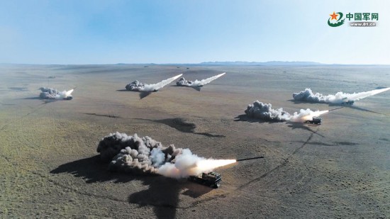 第82集团军某旅深入草原腹地参加联合演练,探索和检验深化陆空协同的训法战法。图为火箭弹出膛瞬间。耿 露摄