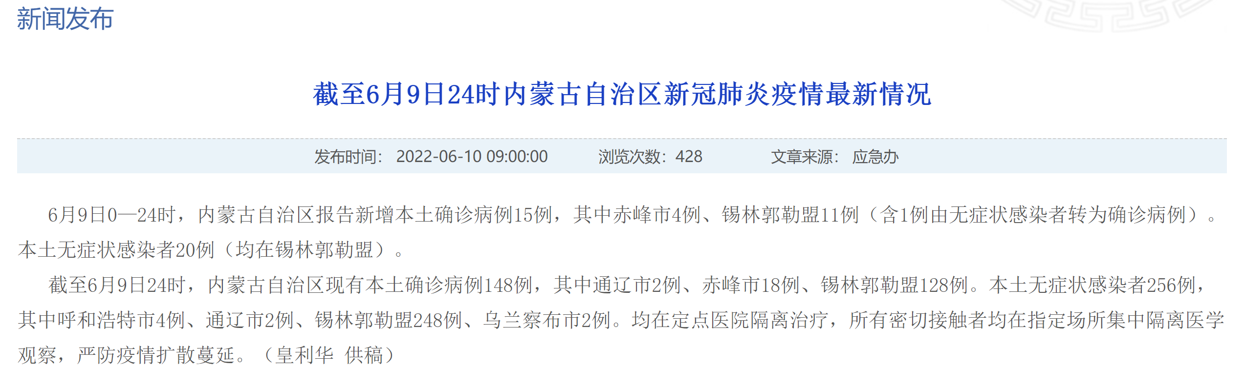 截至6月9日24时,内蒙古自治区现有本土确诊病例148例,其中通辽市2例、赤峰市18例、锡林郭勒盟128例。本土无症状感染者256例,其中呼和浩特市4例、通辽市2例、锡林郭勒盟248例、乌兰察布市2例。均在定点医院隔离治疗,所有密切接触者均在指定场所集中隔离医学观察,严防疫情扩散蔓延。