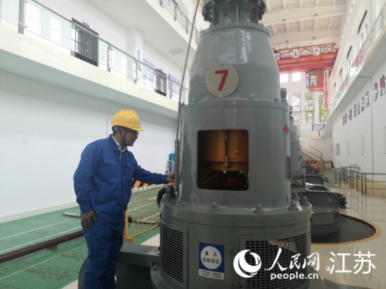 工作人员在江都水利枢纽第四抽水站检查水泵运行。 人民网 张玉峰摄