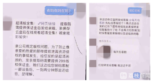 “只需要支付10元,你就可以观看全集了!”在两人的聊天过程中,对方这样告诉小李。想着这个价格确实也不算高,小李很快就通过QQ向对方转了账。转账后,对方便发来了一个网盘的链接,然而小李点击链接却点不开。询问后,对方告诉小李,因为电视剧版权的原因,需再支付299元保证金才能获取提取码,追剧“上了头”的小李便又通过微博钱包向对方支付了299元的保证金。