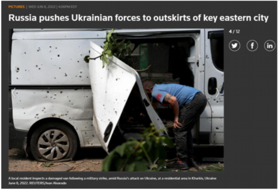 RT称,路透社6月8日发布了一组由该社摄影记者伊万·阿尔瓦拉拍摄的有关乌克兰情况的照片。这组包含12张照片的组图大标题为“俄罗斯将乌克兰军队逼至东部主要城市郊区”,每一张照片都配有不同的图说以介绍内容,其中一张照片上的配文写道:“2022年6月8日,在俄罗斯对乌克兰的攻击中,在乌克兰哈尔科夫一个居民区,在一次军事打击后一名当地居民正在检查一辆受损的汽车。”