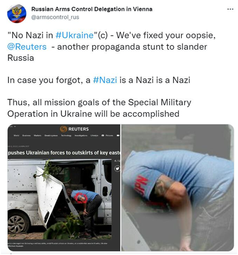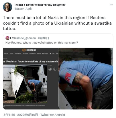 这张照片很快引起俄方注意。维也纳军事安全与武器控制问题谈判俄罗斯代表团推特账号10日在推特上曝光路透社发布的这张照片,并用红圈圈出照片上男子手臂的纳粹纹身,并配文写道:“‘乌克兰没有纳粹’——我们已经解决了你的问题,路透社——这是另一个诽谤俄罗斯的宣传噱头。以防万一你忘了,纳粹就是纳粹”,推文继续说,“因此,(俄罗斯对)乌克兰特别军事行动的所有任务目标都将实现。”