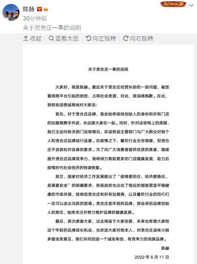 荔枝新闻讯 6月11日上午,演员@陈赫 微博就贤合庄经营纠纷作出回应:“对于贤合庄品牌,我会始终保持创始人的身份和所有门店的加盟商携手共进,永远跟大家在一起。同时,针对这些网上的质疑,我已主动向有关部门说明情况,欢迎各级主管部门与广大群众对我个人和贤合庄品牌进行监督。”