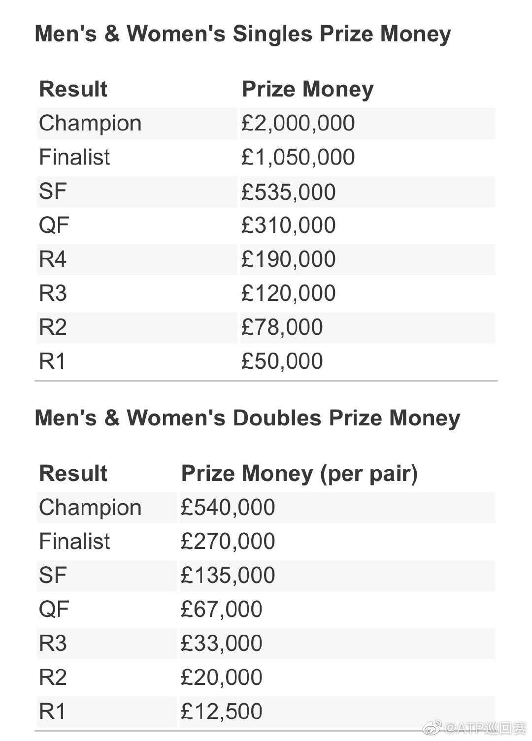 央视网消息:2022温网公布了奖金计划,今年的总奖金将达到4035万英镑,这比去年增长了15%(533.4万英镑),比疫情前的2019年增长了6.2%(235万英镑)。其中男女单打冠军奖金将分别达到200万英镑。