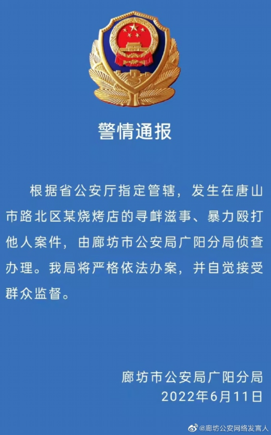 荔枝新闻讯 据“廊坊公安网络发言人”微博消息,根据河北省公安厅指定管辖,发生在唐山市路北区某烧烤店的寻衅滋事、暴力殴打他人案件,由廊坊市公安局广阳分局侦查办理。该局将严格依法办案,并自觉接受群众监督。