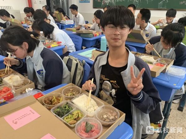 在班主任王涛老师和家委会的精心挑选下,精致搭配了如下菜谱:豉汁蒸排骨寓意“蒸蒸日上”、竹笋烧牛腩寓意“胸有成竹”、筒骨煲花生寓意“妙笔生花”、节瓜炒肉片寓意“节节胜利”、炒苋菜寓意“红红火火”、米饭加迷你粽子寓意“静心宁气,一举高粽”、水果(西瓜)。每一道菜都饱含着初三(7)班全体任课教师和家长对孩子们迎战中考的祝福。