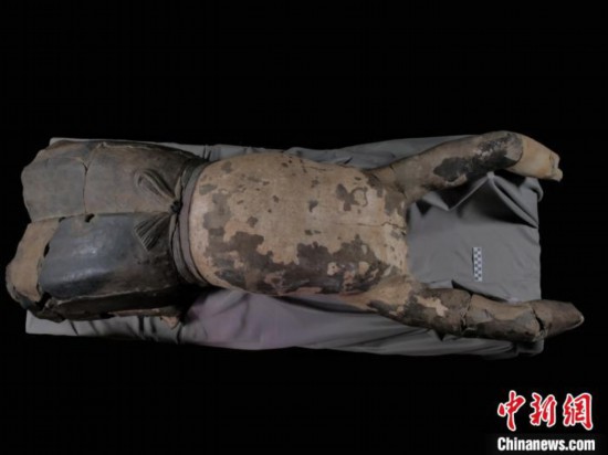 据介绍,由于“28号俑”腹部和背部内壁的裂隙较大,为了保证陶俑修复及展示的安全性,修复人员在内壁用纱布加环氧树脂胶粘剂进行加固处理。考虑到后期的可操作性,“28号俑”目前上半身与下半身暂未粘接。