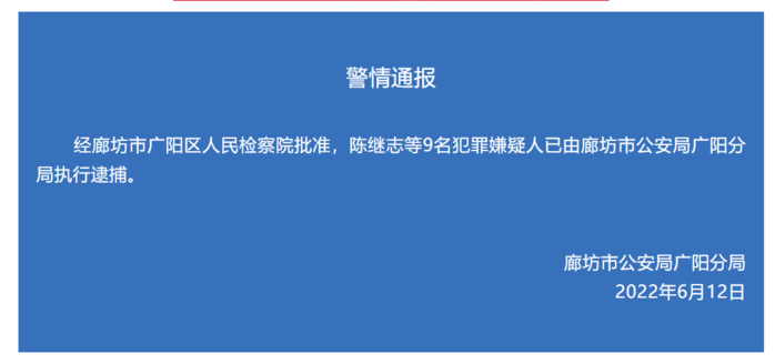 荔枝新闻讯 据“廊坊公安”微信号消息,经廊坊市广阳区人民检察院批准,陈继志等9名犯罪嫌疑人已由廊坊市公安局广阳分局执行逮捕。