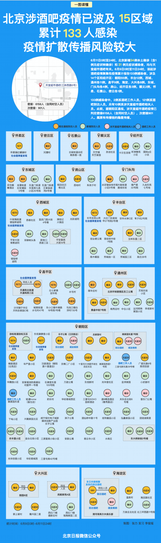 6月9日0时至11日24时,该起涉酒吧疫情聚集性疫情累计报告133例感染者,涉及14个区和经开区。其中,朝阳55例,丰台12例,西城11例,通州11例,昌平9例,海淀8例,大兴8例,东城4例,门头沟4例,房山3例,经开区3例,顺义2例,怀柔、石景山、密云各1例。