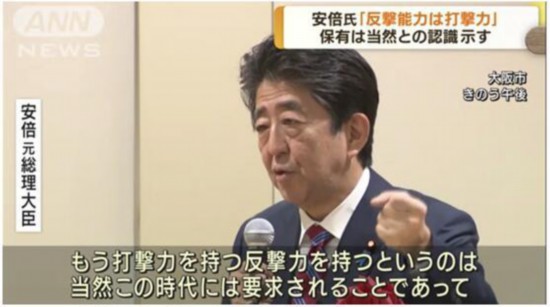报道称,安倍晋三12日下午在大阪市发表演讲,关于所谓“反击能力”(对敌方导弹发射基地等进行攻击的能力),他声称“反击能力就是打击能力”。安倍说,日本拥有“打击能力”是“理所当然”,“这是时代所需,不是说想要发起战争”。他还称:“如果我们(日本)不获得打击能力,美国将会面临是否行使打击能力这个问题。”共同社说,安倍的意思是,拥有“打击能力”将意味着日美同盟能够得到强化。