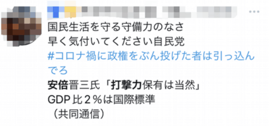 在日本网络上,安倍的激进言论一方面受到部分网民追捧,但另一方面,鉴于现在紧张的国际形势及日本政府在民生经济等方面受到的批评,他的言论也引发担忧和质疑。有网民评论称,“自民党请赶快意识到(政府)欠缺保护国民生活的‘防守能力’”,并喊话安倍,“在疫情期间放弃执政的家伙一边去”。