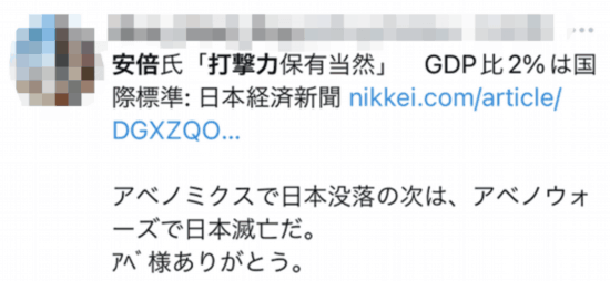 有人警告称:“日本因为‘安倍经济学’而没落,接下来要因为‘安倍战争学’灭亡。真要‘谢谢’安倍。”