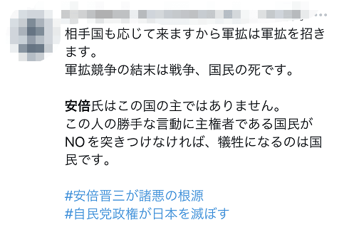 也有网友认为:“扩充军备只会引来对方也扩充军备。军备竞赛的结果只会是战争及死亡。安倍不是这个国家的主人。如果拥有投票权的日本国民不向这个人肆无忌惮的言行说‘NO’,最后牺牲的将是日本国民。”