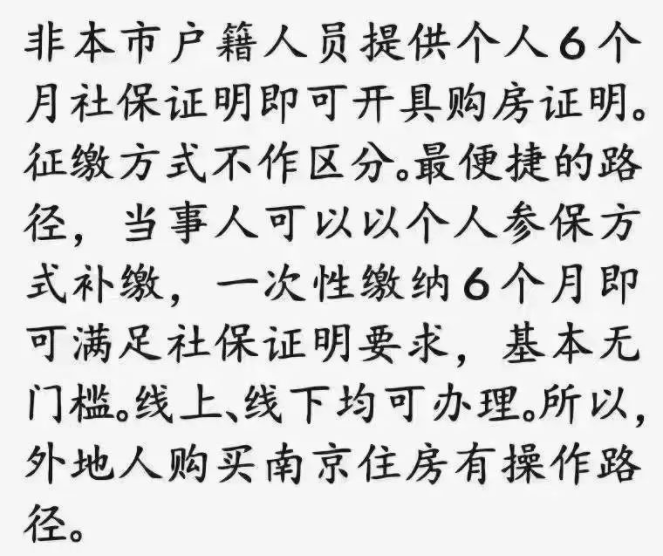 6月13日上午,多位中介人士发布消息指,外地户籍可以补缴6个月社保,以获取在南京的购房资格。扬子晚报/紫牛新闻记者随后向南京市政务服务中心咨询,工作人员告知属实,目前的政策是非南京户籍人员提供个人6个月社保证明即可开具购房证明,且征缴方式不作区分,个人补缴或单位补缴均可。