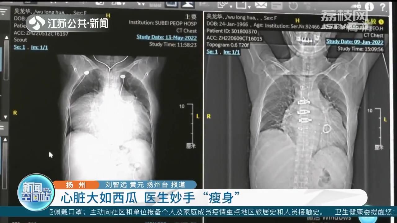 到医院检查后,连医生都被吓到了。原来,吴女士的心脏已几乎占据了整个胸腔,还把两个肺都挤成了原来的四分之一大小。苏北人民医院心脏大血管病中心主任医师唐程斌介绍,正常的心脏拳头大小,患者整个人的心脏可能有一个西瓜大。
